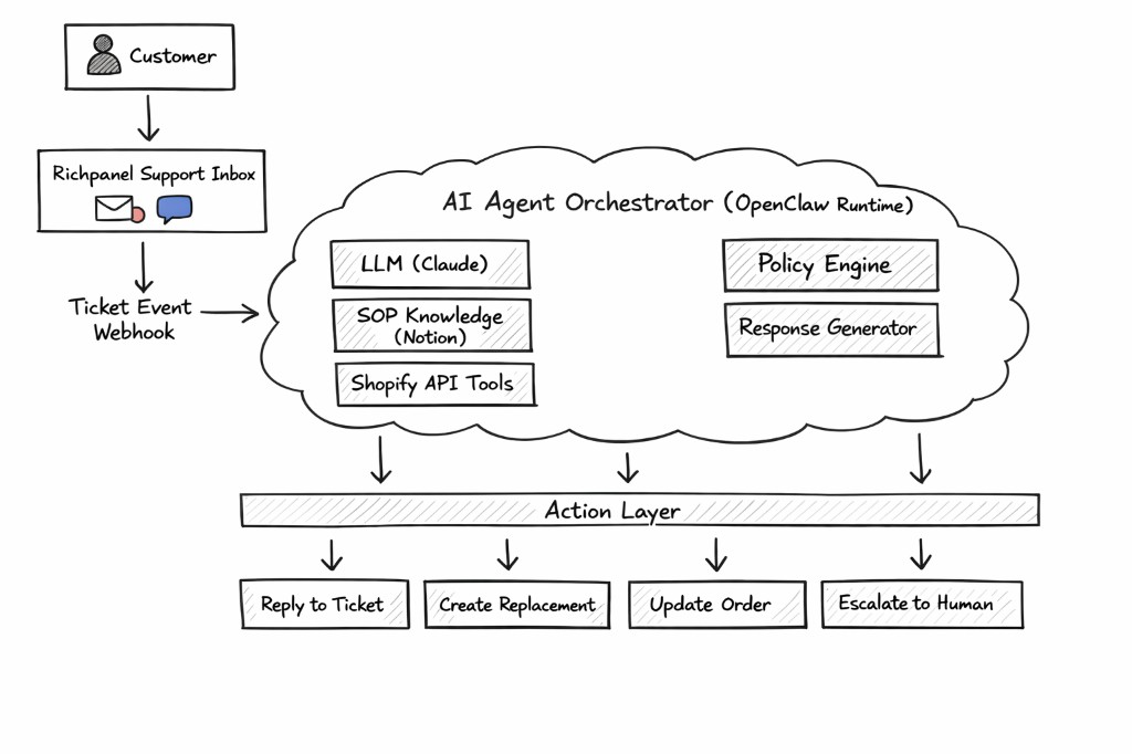 Customer hits your support inbox (we use Richpanel for this—it pulls in email, chat, social). A new ticket fires a webhook. That webhook kicks off the agent orchestrator, which is where OpenClaw lives. Inside the orchestrator you've got Claude doing the reasoning, a knowledge layer (we pull SOPs from Notion), Shopify API tools, a policy engine, and a response generator. The output goes to an action layer: reply to the ticket, create a replacement, update an order, or escalate to a human.